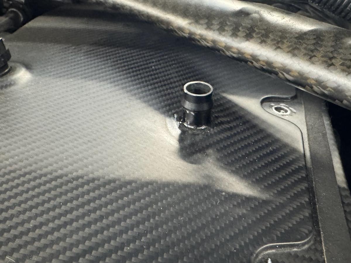 I wasn't prepared to deal with that problem, so I change the oil from the top by sucking it from the dipstick tube. And well I use the CSL dipstick tube, so that meant removing the Slon brace and the front half of the intake. Normally not a big deal, but the vacuum port on my karbonius airbox had debonded a while back, and I knew I'd have to fix this next time the airbox was off, or I wouldn't be able to reconnect that vacuum tube.
