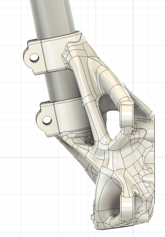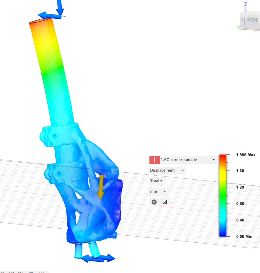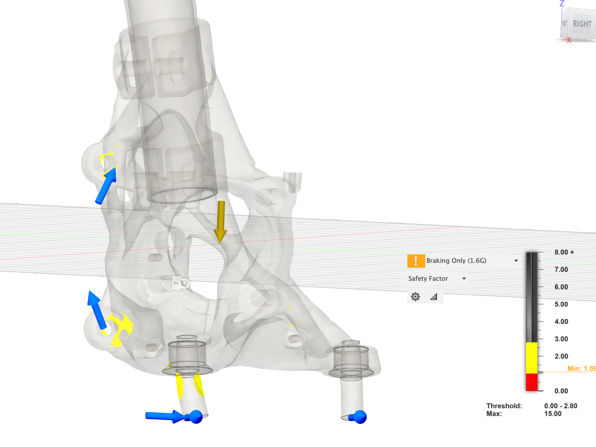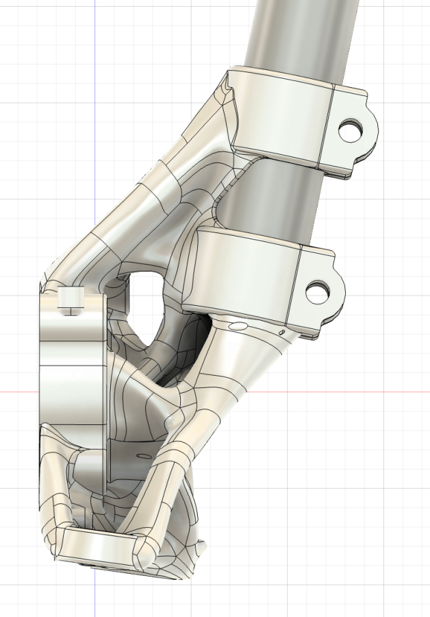 Alright, I forked out the $400 for a Fusion subscription and generative design tokens and finally ran the double clamp version of the steering knuckle.. You'll note in this version that we've reduced displacement at the top of the strut tube to 2mm, which now means <.2 degrees of camber loss at 1.6G corner loads, and we've introduced a simpler to machine pair of inserts in the control arms and tie rods. You'll also see that I didn't explore the saddle clamp idea as it would have been a mass penalty. This double clamp version is only .15kg heavier than the single clamp version and there's technically room for me to optimize this even further to get down to weight-neutral.