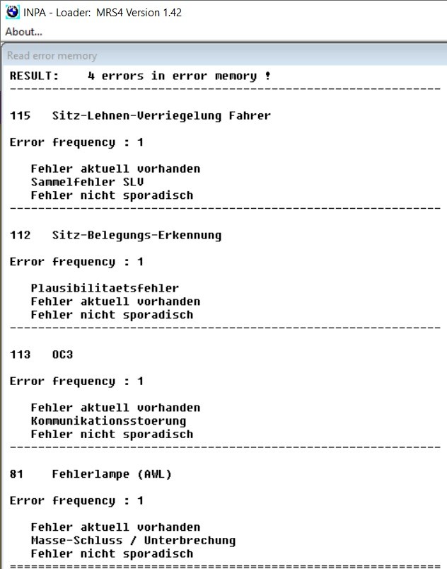 ..which I've tried without luck. INPA throws code "OC3" now, and if I try other combinations, it throws codes for the seat back latch locking.