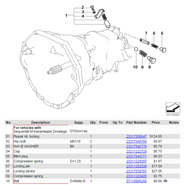 From ECS Tuning: Tranny springs 23311228397 and 23311228405. (The two on the drivers side) One Blind Plug 23317545771