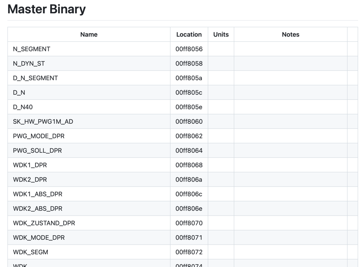 No worries - the translation from 1801 to 0401 was manual. Previous efforts were scripted and resulted in about a 1 in 5 error rate. Which comes down to the way BMW managed the codebase and the way the compiler reorders variable name to memory address assignments. Doing this manually, in this case, results in a much lower error rate and also captured where memory locations have been repurposed, etc.Originally posted by R3VM3UP View Post