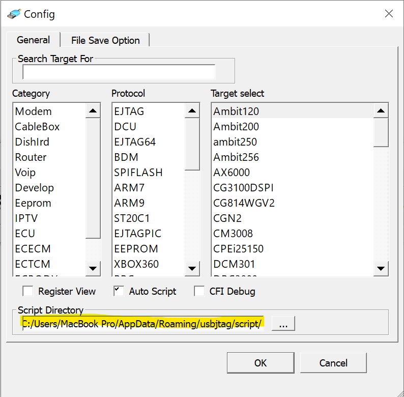 2. Navigate to Tools > Config. Navigate to the script directory and paste the .USP script file into it.