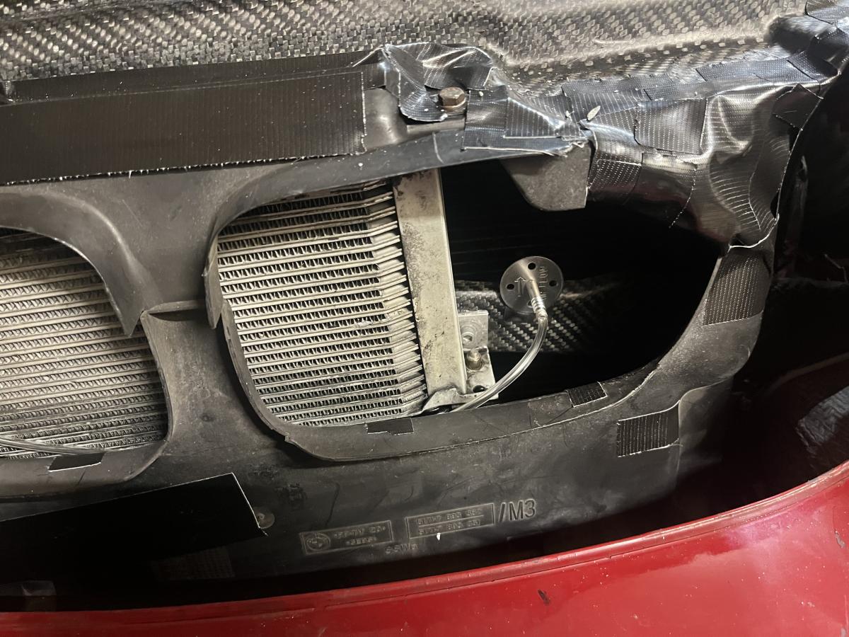 The plan is to use a non-M manual radiator and a large oil cooler mounted on the back. Ideally I'd use a fullface oil cooler. Unfortunately, nothing off the shelf exists at this point. Fabricate a vent on the back of the radiator to vent out of the hood. The idea here is to minimize air coming into the engine bay to reduce drag, improve downforce and be able to use a flimsier hood which can be 2-3 lbs lighter. I currently have a bunch of gaps and openings so I'm guessing I have a big ol' high pressure region under the hood which is made worse with the front splitter.